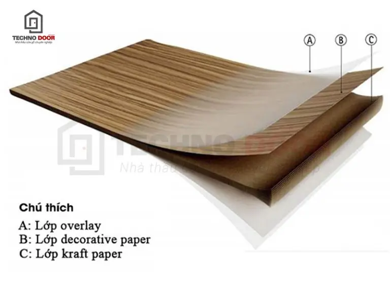 Một tấm Laminate bao gồm một hoặc nhiều lớp giấy, mỗi lớp giấy có chức năng riêng biệt: giấy Kraft, giấy trang trí (decorative paper) và lớp overlay.
